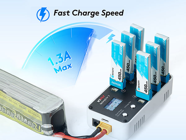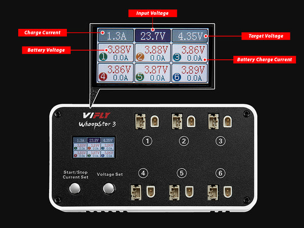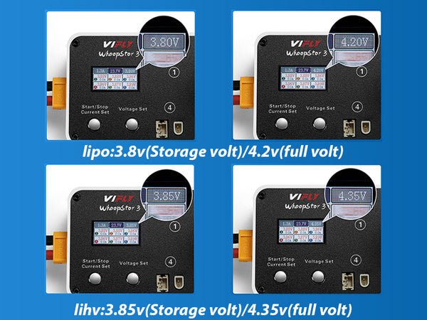 VIFLY WhoopStor 3 представляет собой комбинацию зарядного и разрядного устройства. Он имеет 4 рабочих напряжения (3.8 В / 3.85 В / 4.2 В / 4.35 В). Например, установите целевое напряжение, равное 3.8 В (напряжение для хранения LiPo), и устройство автоматически запустит процесс зарядки или разрядки, когда напряжение аккумулятора опустится ниже или превысит 3.8 В.